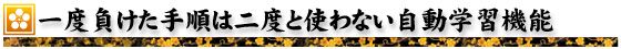 単純になってしまうコンピュータとの対戦。そこで、銀星囲碁8では「一度負けた手順は二度と使わない自動学習機能」を盛り込みました。膨大な定石・布石データに加え長く楽しめる製品です。