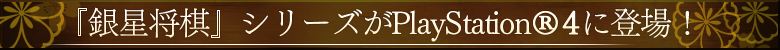 『銀星将棋』シリーズがPlayStation®4に登場! 「11級」から「四段」まで15段階の強さ調整が可能な思考エンジンと、300万手の定跡を搭載し、初心者から上級者までお楽しみいただける、安心の本格将棋ソフトです。 |