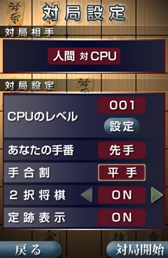 対局前の様々な設定を行う事ができます。CPUのみの対局だけでなく携帯電話1台で人間同士の対局も楽しめます。