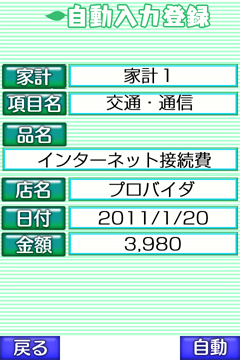 給与や家賃など、毎月決められた額の収支がある場合、自動的に入力する機能です。