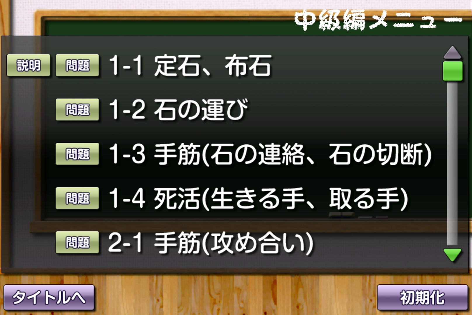 ・中級編 定石・布石の紹介と、今まで学んだことのまとめとなる難度の高い問題全542問を収録しています。