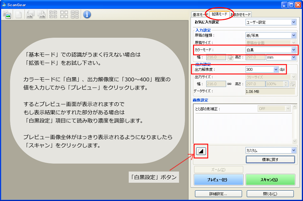 拡張モードでのスキャン