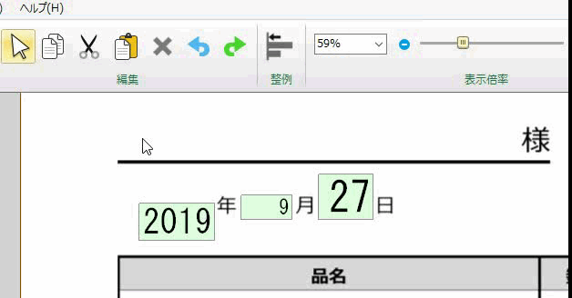 編集画面の書類上にカーソルを移動すると適切な文字オブジェクトのプレビューが表示され、